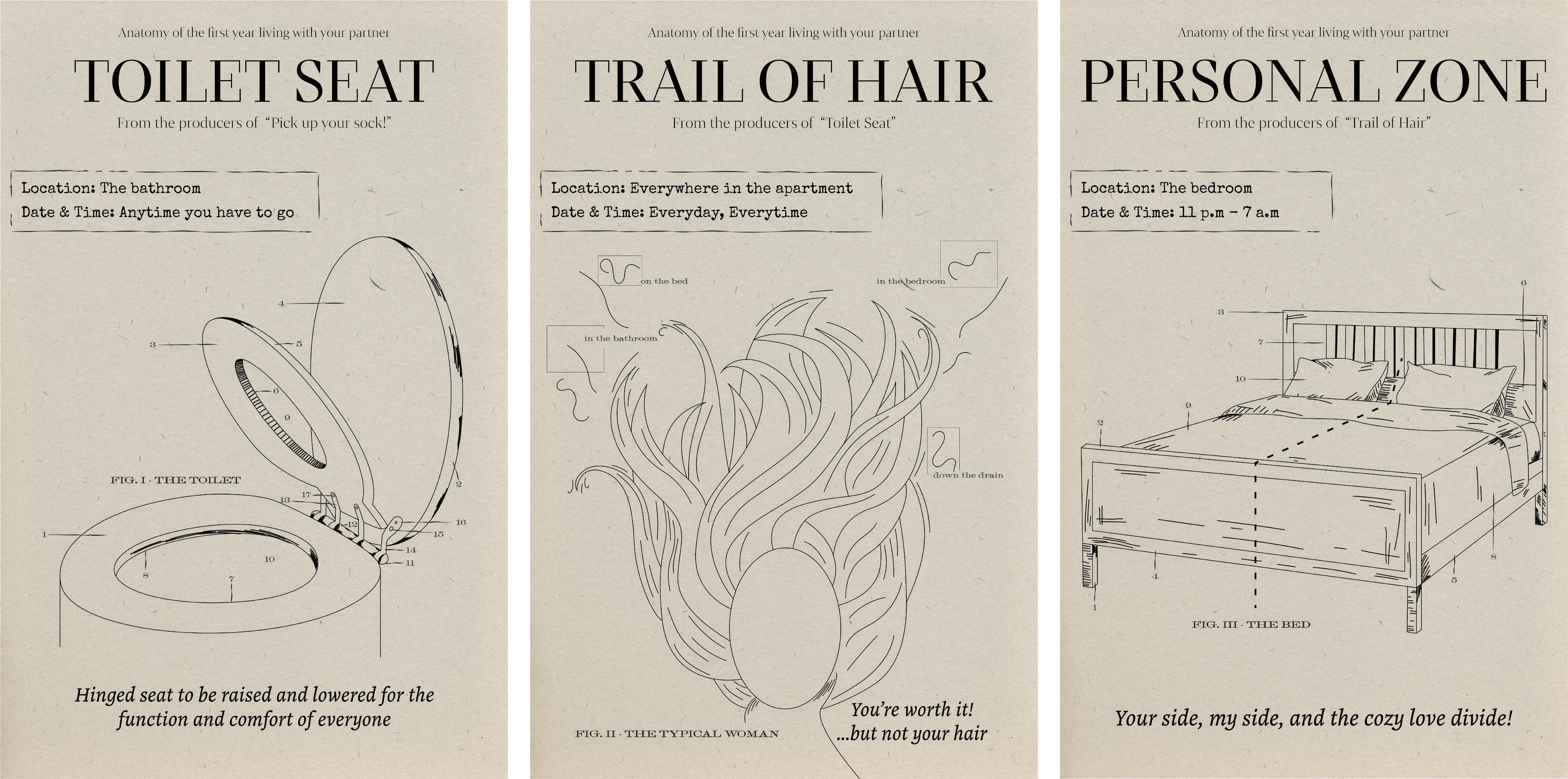 This series dissects the everyday challenges couples face in their first year of living together, breaking them down to their most essential parts. Each poster deconstructs a common cohabitation conflict, showcasing its components, function, and suggested “proper use” with a tongue-in-cheek, educational tone.