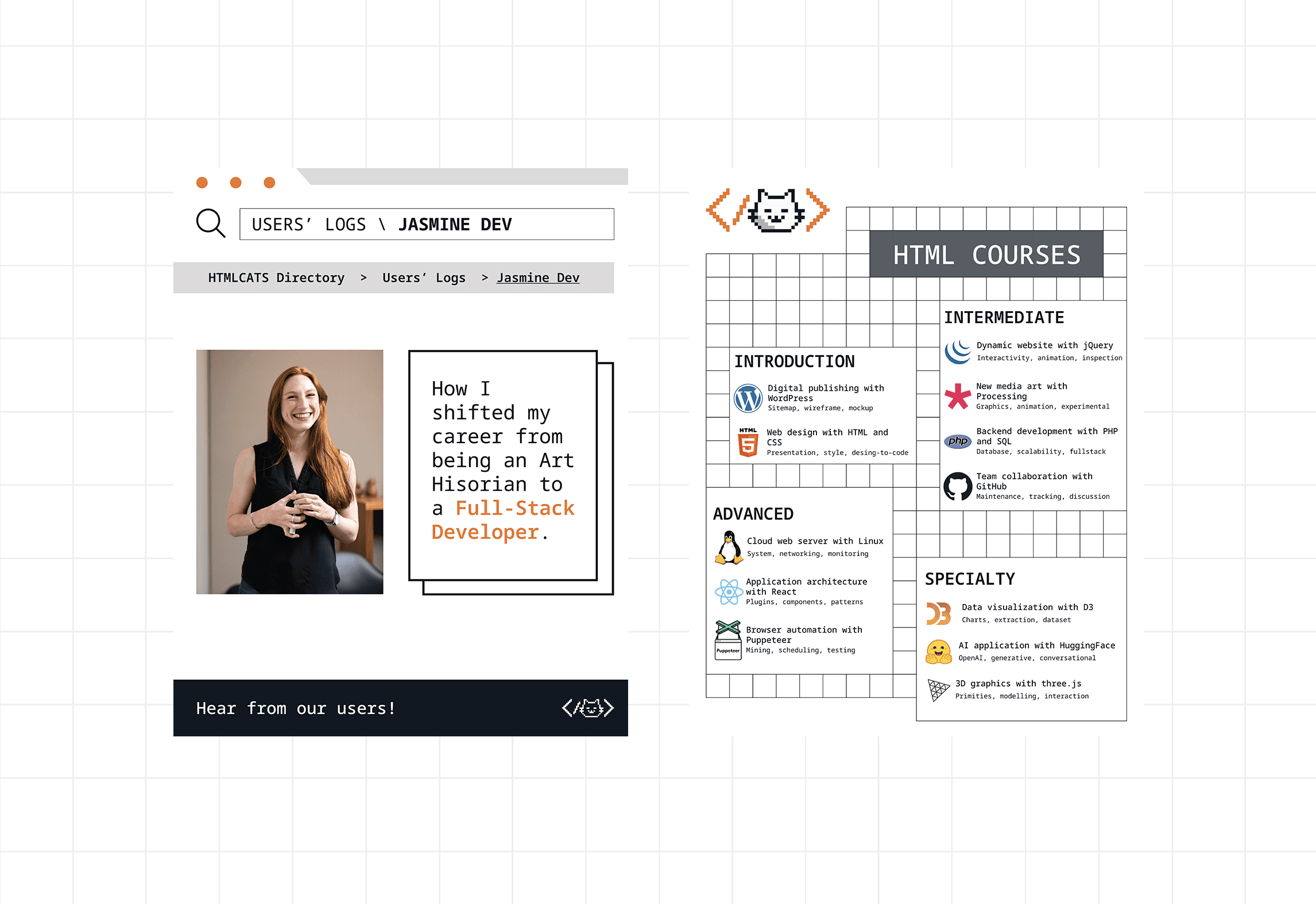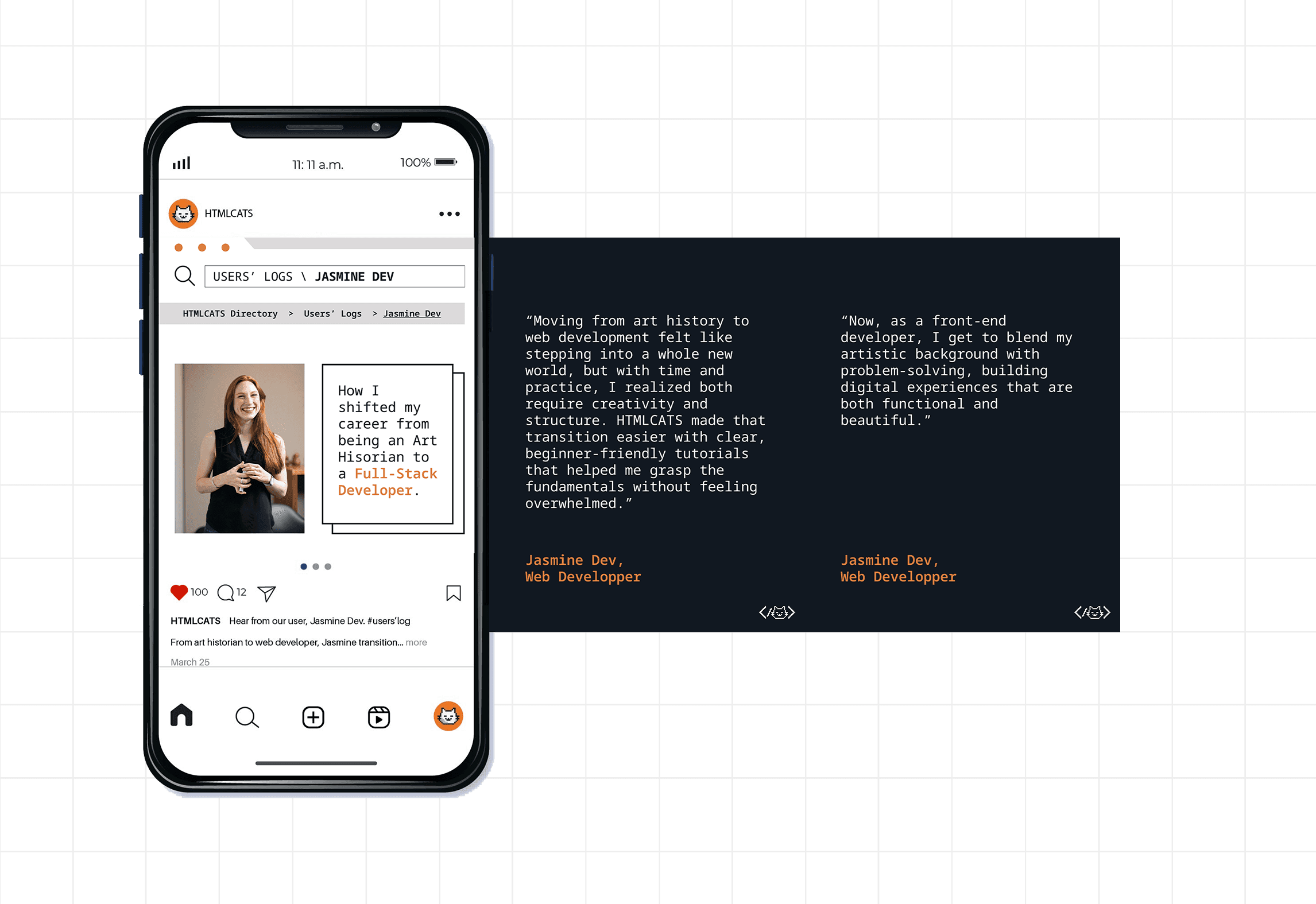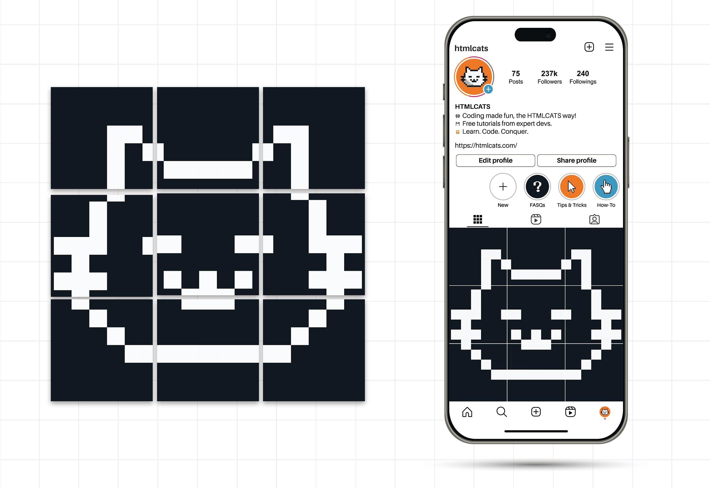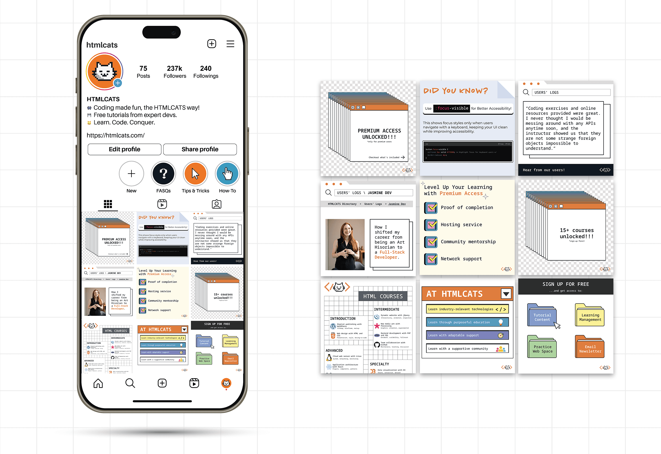 A cohesive set of Instagram assets and templates designed for HTMLCATS, a platform offering hands-on coding tutorials and curated learning paths.